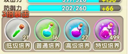 每次提升宠物品阶,都会增加生命值、攻击力和防御力。通过使用培养液来提升这些属性,培养液的品质不同,增加的属性也不同,分为低级、普通、高级和特级。品质越高,提升的基础属性越高,暴击几率也会增加。