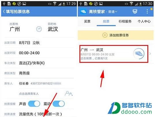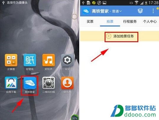 打开高铁管家,在【抢票】面板中,点击【添加抢票任务】