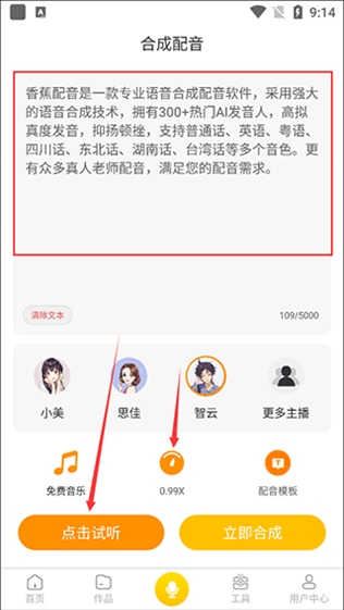 2. 在文本框中输入需要转换为语音的文字(支持一键粘贴),你还可以自由选择配音主播,并调节语速,试听配音效果;
