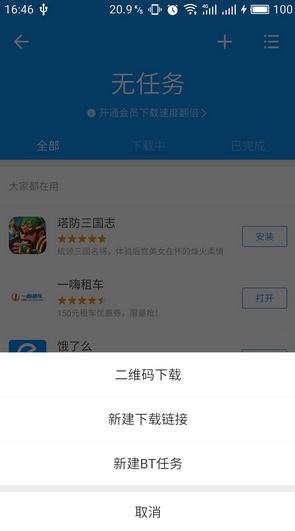 1、打开手机迅雷并切换到“下载”模块,点击右上角的“+”号,可以看到三种创建下载的方式——二维码下载、新建任务和新建BT任务。按照电脑上的操作习惯,先试试“新建”功能。在新建界面中,只需在输入框输入HTTP、BT种子或电驴地址,即可开始下载。